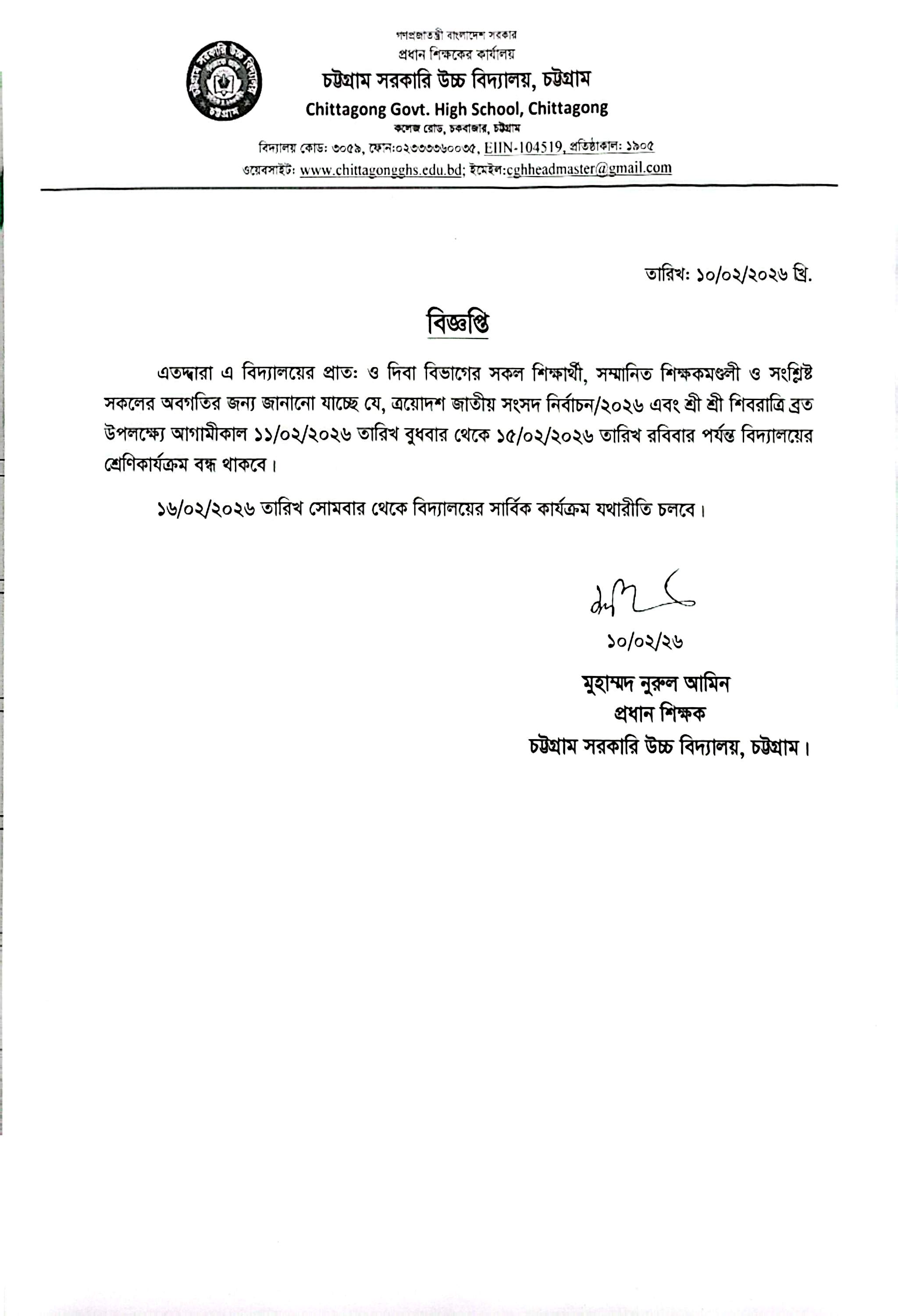 ত্রয়োদশ জাতীয় সংসদ নির্বাচন, ২০২৬ ও শ্রী শ্রী শিবরাত্রি ব্রত উপলক্ষ্যে বিদ্যালয়ের শ্রেণি কার্যক্রম বন্ধ সংক্রান্ত ----