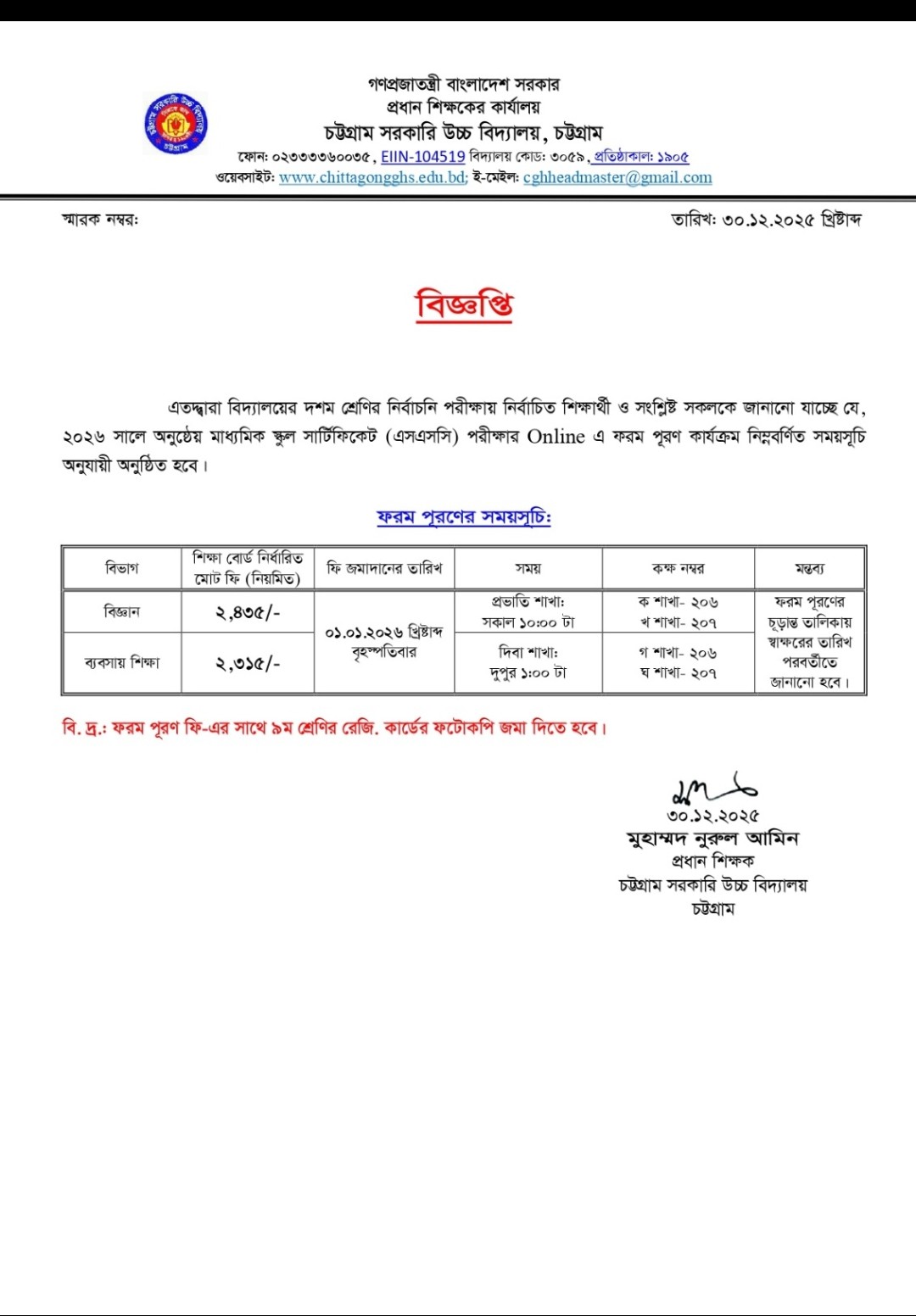 ২০২৬ সালের এসএসসি পরীক্ষার্থীদের ফরম পূরণের ফি সংক্রান্ত --